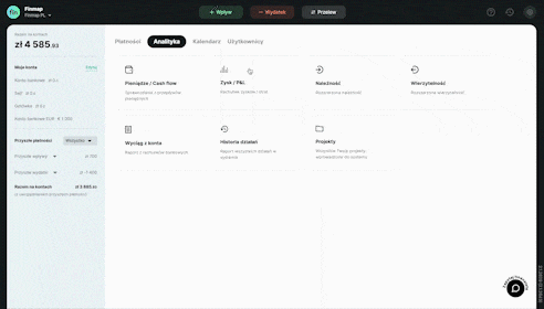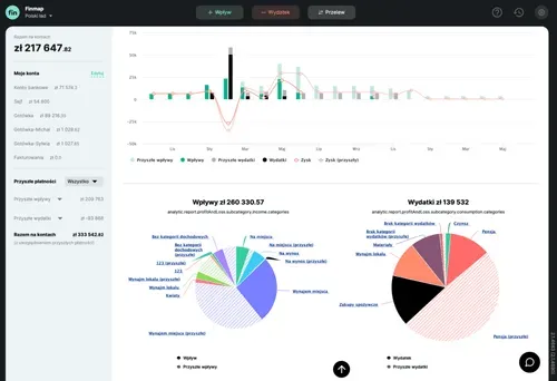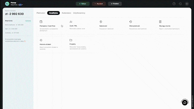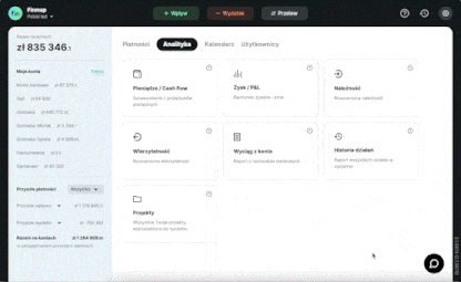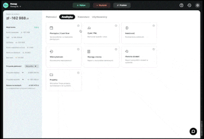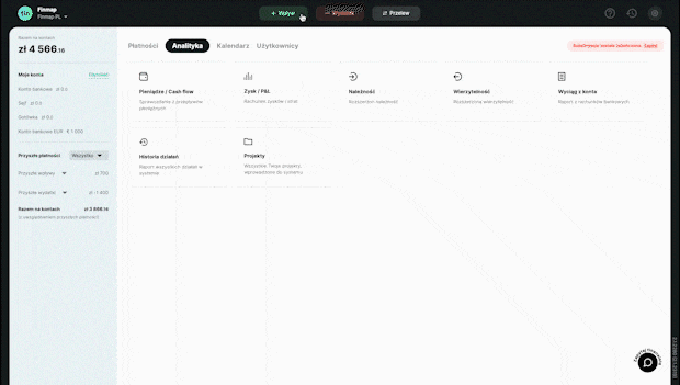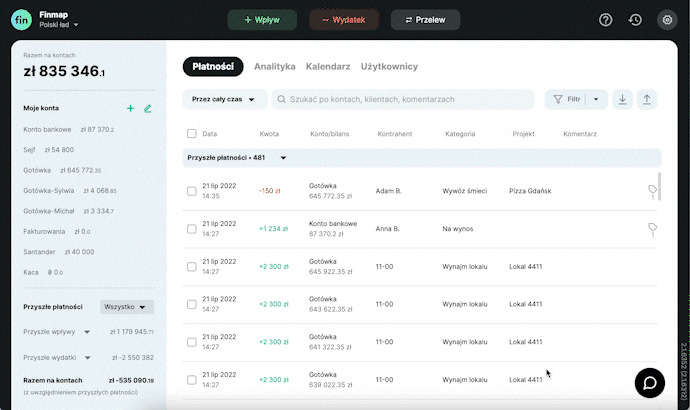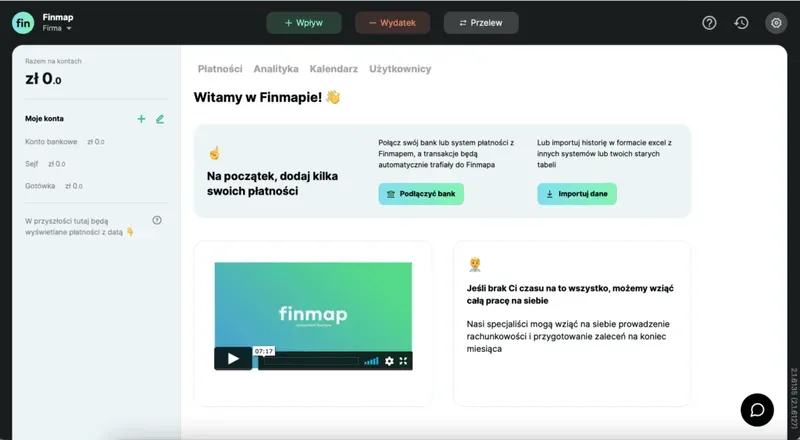 Zarejestruj się w Finmap Wprowadź swoje dane i utwórz profil swojej firmy ✅ Nie wymagamy podawania żadnych oficjalnych danych, możesz podać dowolną nazwę firmyWprowadź pierwsze operacje Ręcznie, za pomocą zaledwie 3 przycisków. Lub automatycznie, podłączając swoje konta bankowe albo importując dane z Excela/banku. Możesz zacząć od, na przykład, 10 operacji.Poznaj swoje CashFlow Raport Pieniądze/Cash Flow już został automatycznie utworzony. Możesz tu i teraz zobaczyć na zrozumiałym panelu, ile pieniędzy wpłynęło na Twoje konto, a ile z niego wyszło.Co dalej? Możesz oddelegować prowadzenie rachunkowości, stworzyć spersonalizowane filtry, zaplanować przyszłe transakcje… Wszystko zależy od Twoich potrzeb.