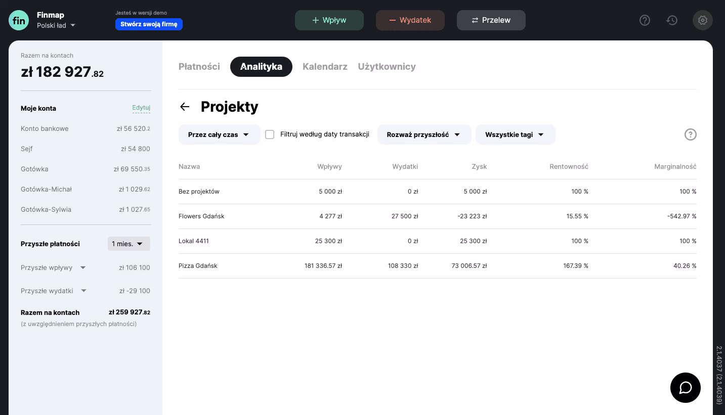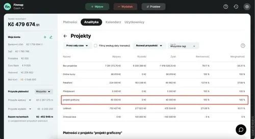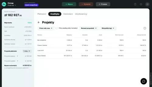 Raport Projekty pokaże wszystkie wpływy, wydatki, zysk, rentowność i marginalność każdego kierunku, który utworzysz w profilu Finmap w postaci projektu.